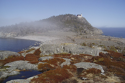 Daily boat service in summer from Bönhamn and Barsta to Högbonden. Lighthouse on top of vertical rock face. Prehistoric finds of fishing and seal hunting activities.