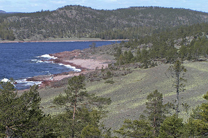 Old shorelines show the effects of the ongoing land uplift, following the last Ice Age. Prehistoric site with 14 cairns from the Bronze Age.  Viewing platform shaped as an inverted ship frame.