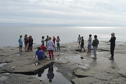 A 4 km long seashore stretch of flat diabase bedrock, worn down and polished by the sea to ”dance floors”.